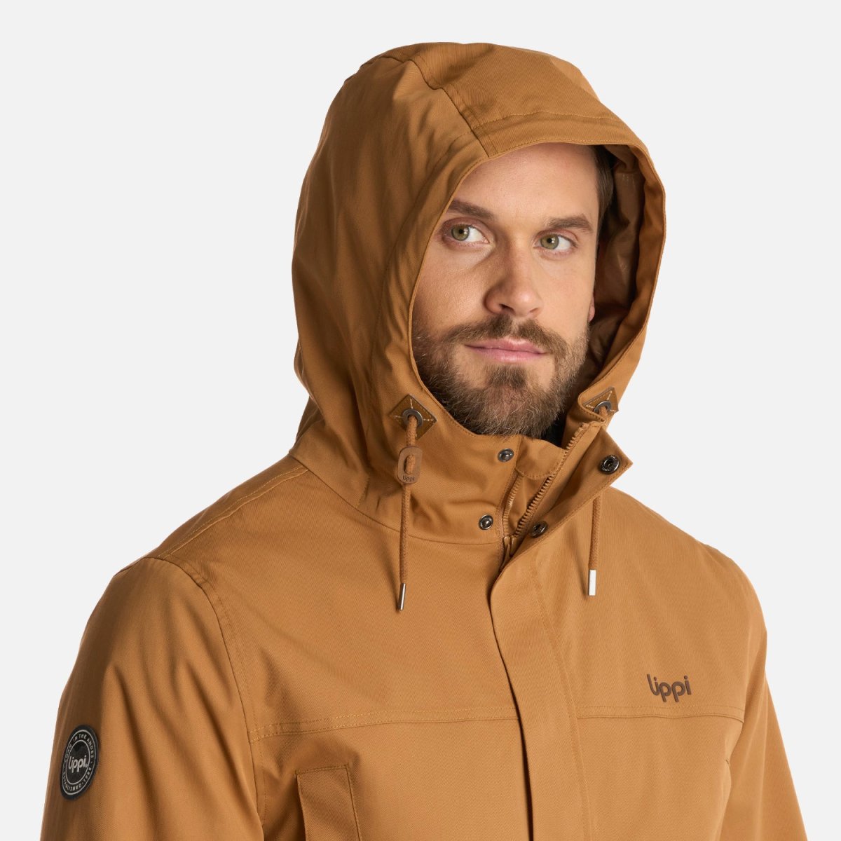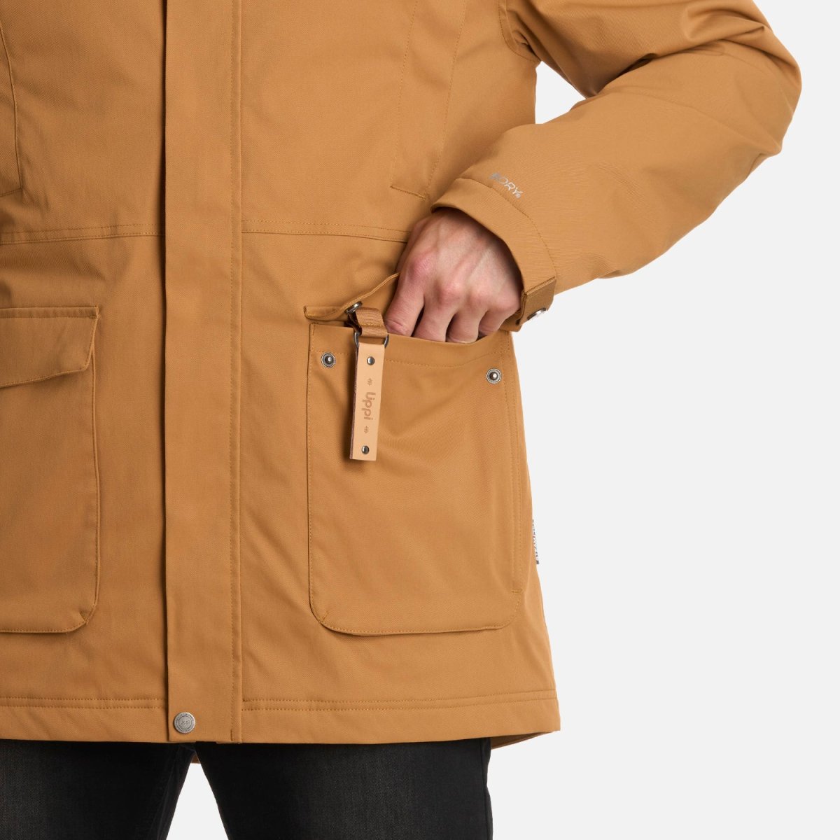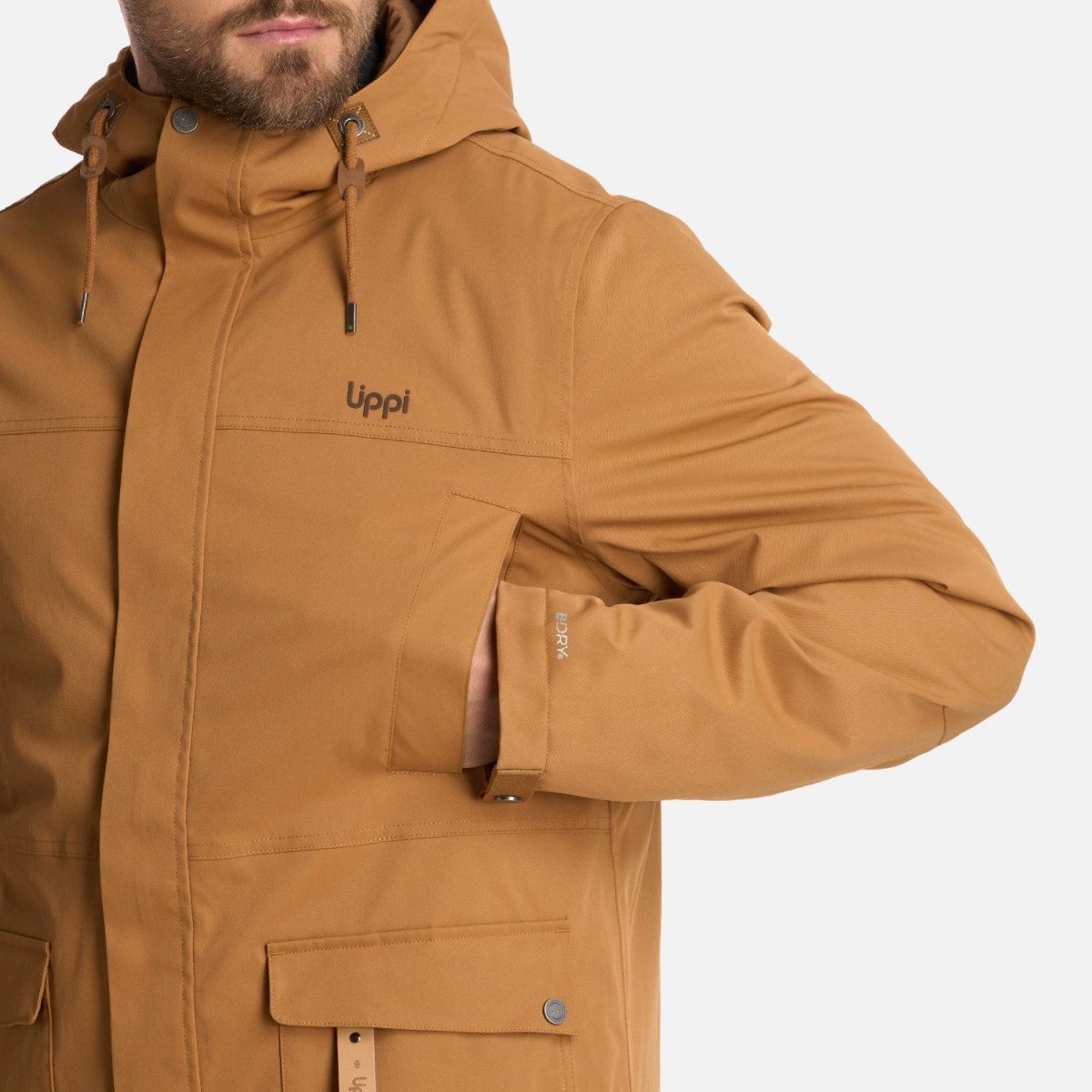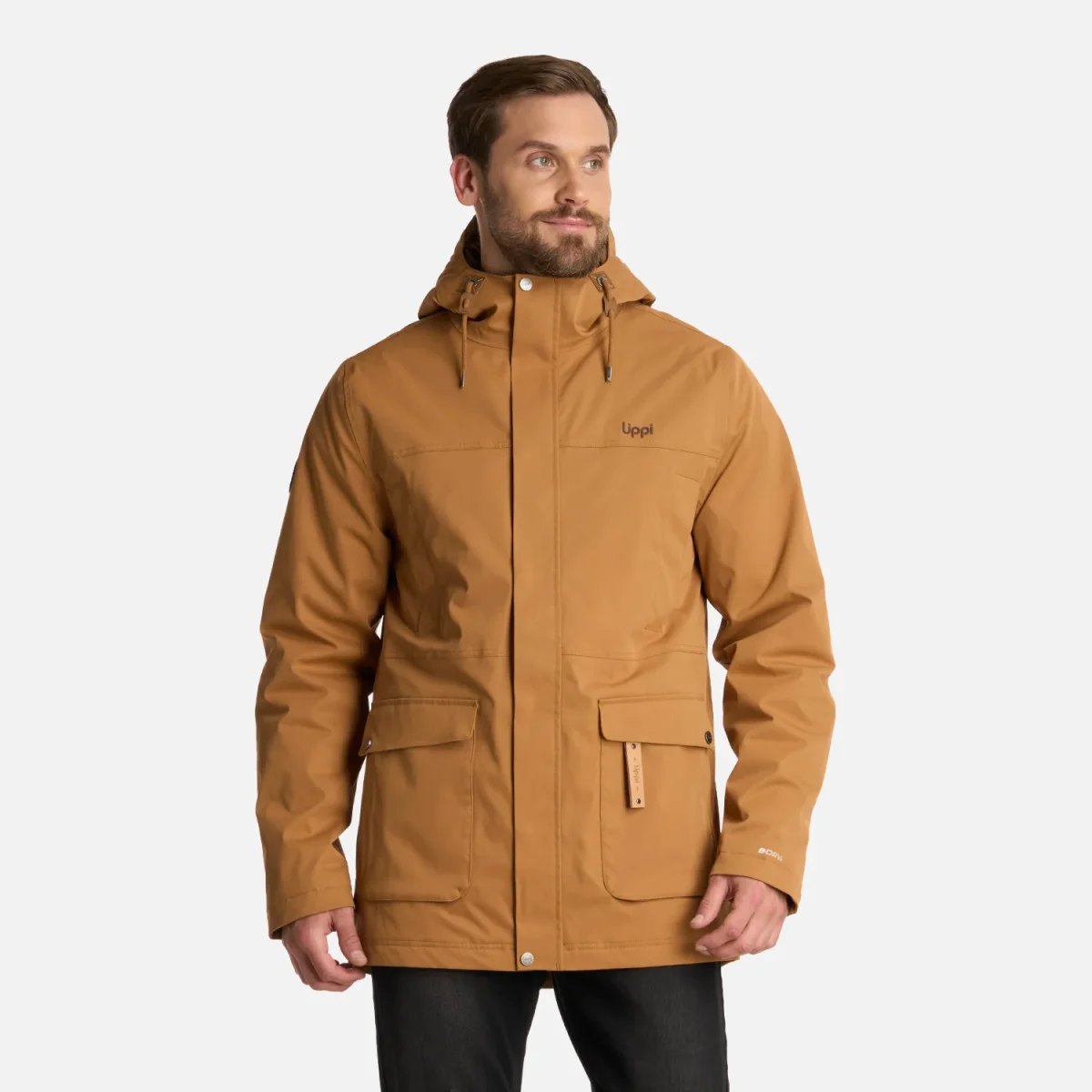 Chaqueta impermeable tecnología B-dry ® Costuras termoselladas Membrana 10.000/10.000 Cierre principal YKK y tapeta con broches Bolsillos en pecho con broches Bolsillos de mano de parche con tapeta y broches metálicos Interior insulado con relleno sintético 100% reciclado Bolsillos internos Gorro con ajuste de tankas Llavero decorativo Ajuste de puños con broches