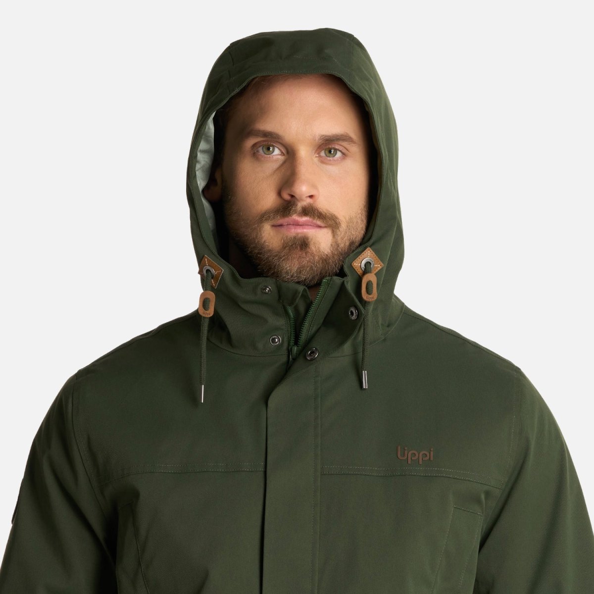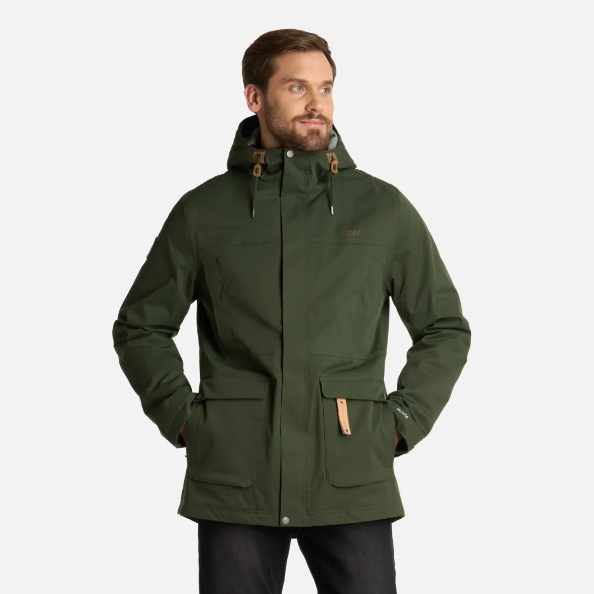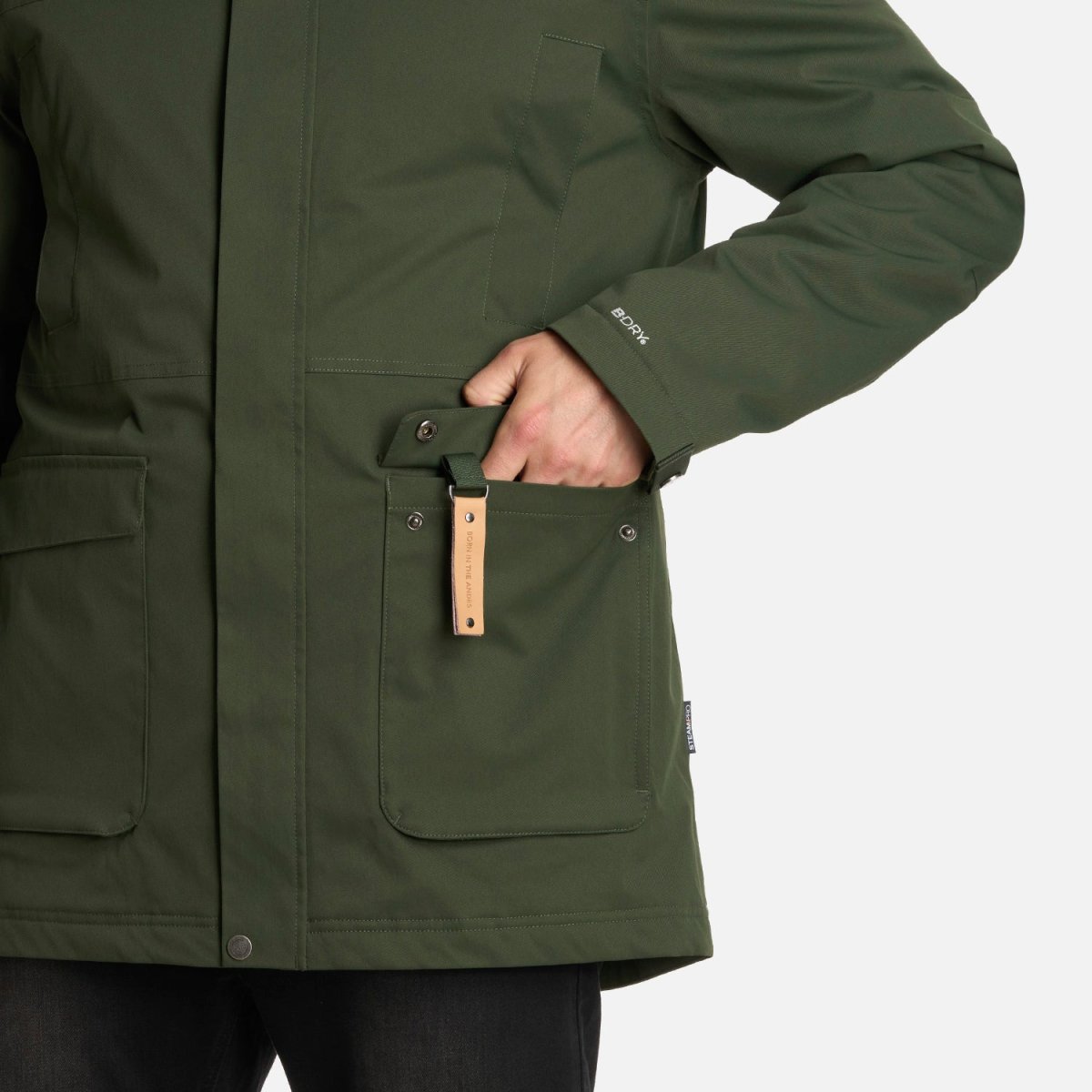 Chaqueta impermeable tecnología B-dry ® Costuras termoselladas Membrana 10.000/10.000 Cierre principal YKK y tapeta con broches Bolsillos en pecho con broches Bolsillos de mano de parche con tapeta y broches metálicos Interior insulado con relleno sintético 100% reciclado Bolsillos internos Gorro con ajuste de tankas Llavero decorativo Ajuste de puños con broches